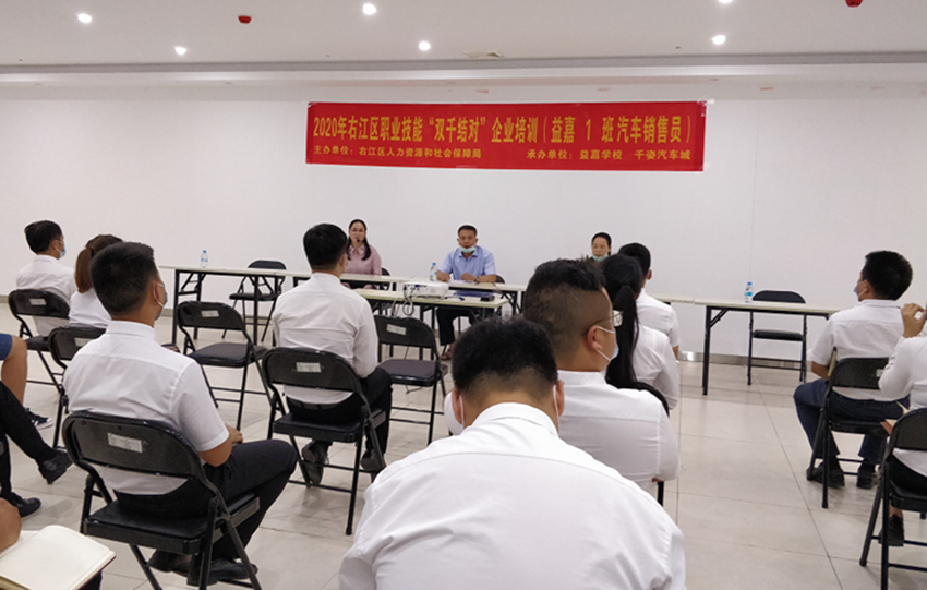 近日,由百色市右江區(qū)人力資源和社會(huì)保障局主辦,廣西百色益嘉職業(yè)技能培訓(xùn)學(xué)校、右江區(qū)新姿投資股份有限公司承辦的2020年右江區(qū)職業(yè)技能“雙千結(jié)對(duì)”企業(yè)培訓(xùn)(益嘉1班汽車銷售員)在千姿汽車城順利開(kāi)班,培訓(xùn)期十天,約50名汽車銷售人員參加培訓(xùn)。