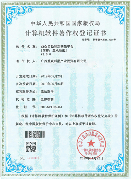 益眾后勤移動購物平臺獲國家版權(quán)局頒發(fā)計算機軟件著作權(quán)登記證書