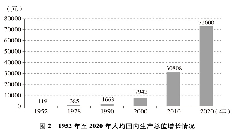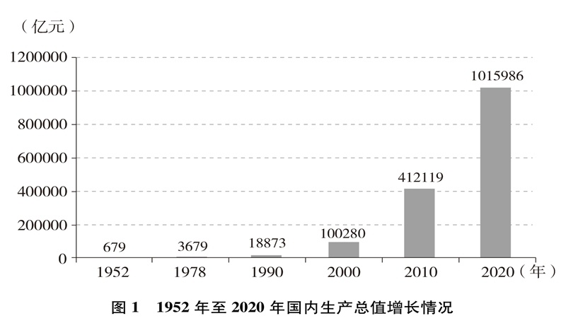 經(jīng)濟(jì)實(shí)力大幅提升。中國(guó)國(guó)內(nèi)生產(chǎn)總值從1952年的679.1億元躍升至2020年的101.6萬(wàn)億元,經(jīng)濟(jì)總量占全球經(jīng)濟(jì)比重超過(guò)17%,穩(wěn)居世界第二大經(jīng)濟(jì)體(圖1)。人均國(guó)內(nèi)生產(chǎn)總值從1952年的幾十美元增至2020年的超過(guò)1萬(wàn)美元,實(shí)現(xiàn)從低收入國(guó)家到中等偏上收入國(guó)家的歷史性跨越(圖2)。制造業(yè)增加值多年位居世界首位,220多種工業(yè)產(chǎn)品產(chǎn)量居世界第一,自2010年起連續(xù)11年位居世界第一制造業(yè)大國(guó)。中國(guó)已是全球貨物貿(mào)易第一大國(guó)、服務(wù)貿(mào)易第二大國(guó)、商品消費(fèi)第二大國(guó)、外匯儲(chǔ)備第一大國(guó),2020年利用外資居全球第一。不斷邁向共同富裕的14億多人口,其中有超過(guò)4億并不斷擴(kuò)大的中等收入群體,是全球最具成長(zhǎng)性的超大規(guī)模市場(chǎng),中國(guó)經(jīng)濟(jì)充滿活力,具有巨大潛力和充足后勁。2020年,中國(guó)率先控制新冠肺炎疫情,率先復(fù)工復(fù)產(chǎn),率先實(shí)現(xiàn)經(jīng)濟(jì)增長(zhǎng)由負(fù)轉(zhuǎn)正,充分彰顯中國(guó)經(jīng)濟(jì)的強(qiáng)勁韌性。