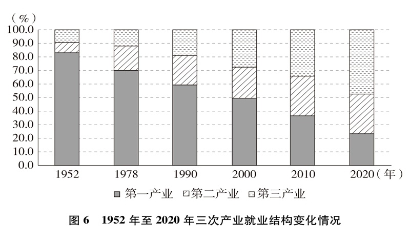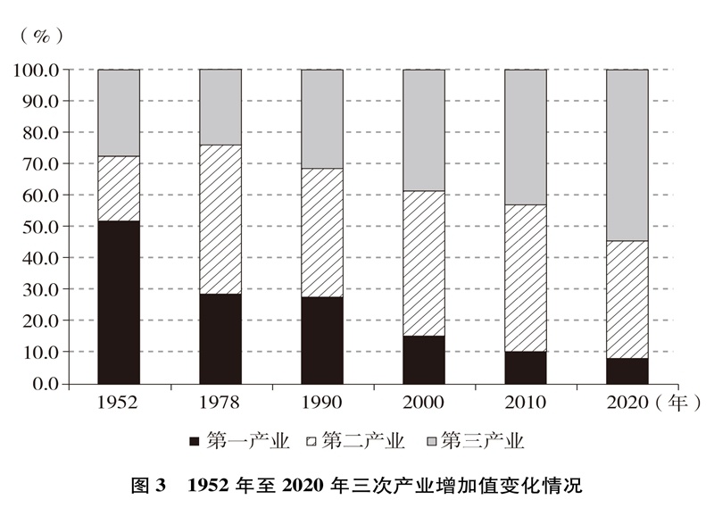 產(chǎn)業(yè)結(jié)構(gòu)優(yōu)化升級(jí)。中國(guó)已建成世界上最完整的產(chǎn)業(yè)體系,產(chǎn)業(yè)發(fā)展持續(xù)向中高端邁進(jìn)。三次產(chǎn)業(yè)增加值之比從1952年的50.5∶20.8∶28.7到2020年的7.7∶37.8∶54.5,中國(guó)從傳統(tǒng)農(nóng)業(yè)大國(guó)成為工業(yè)大國(guó)、服務(wù)業(yè)大國(guó)(圖3),中國(guó)經(jīng)濟(jì)從依賴單一產(chǎn)業(yè)為主轉(zhuǎn)向依靠三次產(chǎn)業(yè)共同帶動(dòng)。農(nóng)業(yè)現(xiàn)代化成效顯著,機(jī)械化、數(shù)字化、綠色化、功能化、共享化水平明顯提高,廣大農(nóng)民逐步告別“面朝黃土背朝天、一身力氣百身汗”的辛勞,農(nóng)村生產(chǎn)力極大解放;糧食生產(chǎn)能力穩(wěn)步提升,實(shí)現(xiàn)谷物基本自給,中國(guó)人把飯碗牢牢端在自己手中。中國(guó)建成門(mén)類齊全、獨(dú)立完整的現(xiàn)代工業(yè)體系,工業(yè)化和信息化融合發(fā)展的廣度和深度不斷拓展,“中國(guó)制造”向“中國(guó)智造”轉(zhuǎn)型升級(jí),產(chǎn)業(yè)鏈供應(yīng)鏈現(xiàn)代化水平進(jìn)一步提升。以新一代信息技術(shù)、生物技術(shù)、高端裝備、綠色環(huán)保為代表的戰(zhàn)略性新興產(chǎn)業(yè)發(fā)展迅速,成為引領(lǐng)高質(zhì)量發(fā)展的重要引擎。數(shù)字經(jīng)濟(jì)激發(fā)經(jīng)濟(jì)發(fā)展新活力,產(chǎn)業(yè)數(shù)字化和數(shù)字產(chǎn)業(yè)化趨勢(shì)加快。現(xiàn)代服務(wù)業(yè)加速發(fā)展,以“互聯(lián)網(wǎng)+”為標(biāo)志的新業(yè)態(tài)、新模式層出不窮,平臺(tái)經(jīng)濟(jì)、共享經(jīng)濟(jì)蓬勃興起,生產(chǎn)性服務(wù)業(yè)向?qū)I(yè)化和高端化發(fā)展,生活性服務(wù)業(yè)向精細(xì)化和高品質(zhì)轉(zhuǎn)變。產(chǎn)業(yè)結(jié)構(gòu)的優(yōu)化升級(jí)促進(jìn)了經(jīng)濟(jì)更加均衡、更加充分的發(fā)展,人們個(gè)性化品質(zhì)化多樣化需求不斷得到滿足。