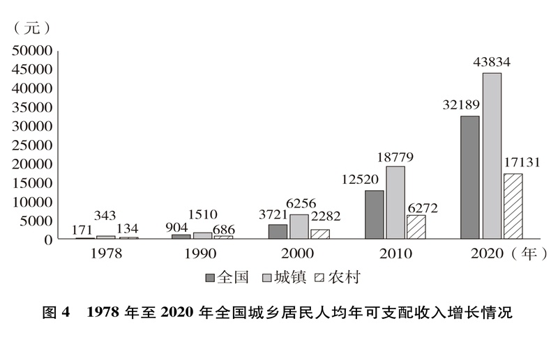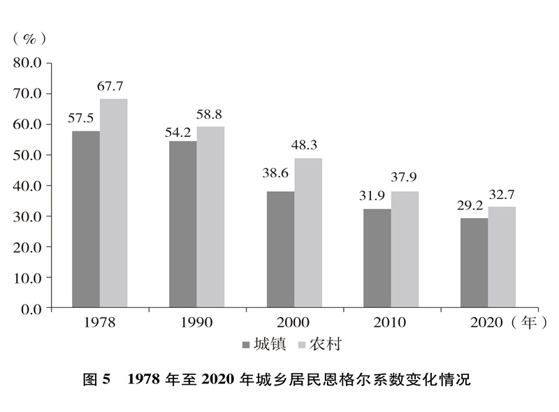 人民生活水平顯著提高。居民收入持續(xù)增加,全國(guó)居民人均年可支配收入從1978年的171元增加到2020年的32189元(圖4)。城鄉(xiāng)居民恩格爾系數(shù)分別從1978年的57.5%、67.7%下降到2020年的29.2%、32.7%(圖5),城鄉(xiāng)居民生活質(zhì)量不斷提升。溫飽問(wèn)題解決后,人們對(duì)生活品質(zhì)、品位有了更高的追求,衣食住行不斷升級(jí),消費(fèi)結(jié)構(gòu)從生存型逐漸向發(fā)展型、享受型過(guò)渡。衣,從穿暖到穿美、穿出時(shí)尚;食,從吃飽到吃好、吃出健康;住,從有所居到更敞亮、更宜居;行,從便利通暢到快捷舒適。吃穿用有余,家電全面普及,乘用汽車快速進(jìn)入尋常百姓家。餐飲、健康、教育、旅游、文娛等服務(wù)性消費(fèi)持續(xù)快速增長(zhǎng),在居民人均消費(fèi)支出中占比逐漸達(dá)到一半左右。越來(lái)越多的人有“錢(qián)”有“閑”,“詩(shī)和遠(yuǎn)方”更加觸手可及,“說(shuō)走就走”不再是夢(mèng)想,旅游扮靚人們的幸福生活,中國(guó)正在進(jìn)入大眾旅游時(shí)代。