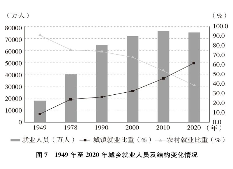 就業(yè)局勢(shì)長(zhǎng)期穩(wěn)定,就業(yè)質(zhì)量顯著提升。就業(yè)人數(shù)從1949年的1.8億增加到2020年的7.5億,就業(yè)規(guī)模不斷擴(kuò)大;從絕大多數(shù)勞動(dòng)者以農(nóng)業(yè)為生到第三產(chǎn)業(yè)就業(yè)人數(shù)占47.7%(圖6)、城鎮(zhèn)就業(yè)人數(shù)占61.6%(圖7),就業(yè)結(jié)構(gòu)不斷優(yōu)化;從勞動(dòng)者普遍處于文盲半文盲狀態(tài)到勞動(dòng)年齡人口平均受教育年限10.8年、技能人才總量約2億,就業(yè)人員素質(zhì)大幅提高。億萬(wàn)勞動(dòng)者擁有自己熱愛(ài)的工作,開(kāi)啟幸福生活的大門(mén)。從計(jì)劃分配到市場(chǎng)就業(yè)、自由擇業(yè)、自主創(chuàng)業(yè),從傳統(tǒng)就業(yè)方式到新就業(yè)形態(tài),勞動(dòng)者的就業(yè)觀念深刻變革、就業(yè)空間更加廣闊、就業(yè)方式日益多元。人們的興趣愛(ài)好、特長(zhǎng)稟賦與個(gè)人就業(yè)意愿、社會(huì)需求、國(guó)家需要更好結(jié)合,自我價(jià)值更好實(shí)現(xiàn),主動(dòng)性創(chuàng)造性顯著增強(qiáng),創(chuàng)新創(chuàng)造熱情不斷迸發(fā)。勞動(dòng)者合法權(quán)益得到保障,勞動(dòng)報(bào)酬保持增長(zhǎng),勞動(dòng)所得受到保護(hù),人們?cè)絹?lái)越有尊嚴(yán)地勞動(dòng)、快樂(lè)地勞動(dòng),依靠自己的雙手創(chuàng)造美好生活。從“單休制”到“雙休制”,從“黃金周”到帶薪年休假,勞動(dòng)者休息休假權(quán)益越來(lái)越有保障,工作生活更加平衡。勞動(dòng)最光榮、最崇高、最偉大、最美麗日益成為全社會(huì)的共識(shí)和行動(dòng),勤奮做事、勤勉為人、勤勞致富成為風(fēng)尚,崇尚勞動(dòng)、尊重勞動(dòng)、熱愛(ài)勞動(dòng)的社會(huì)氛圍更加濃厚。