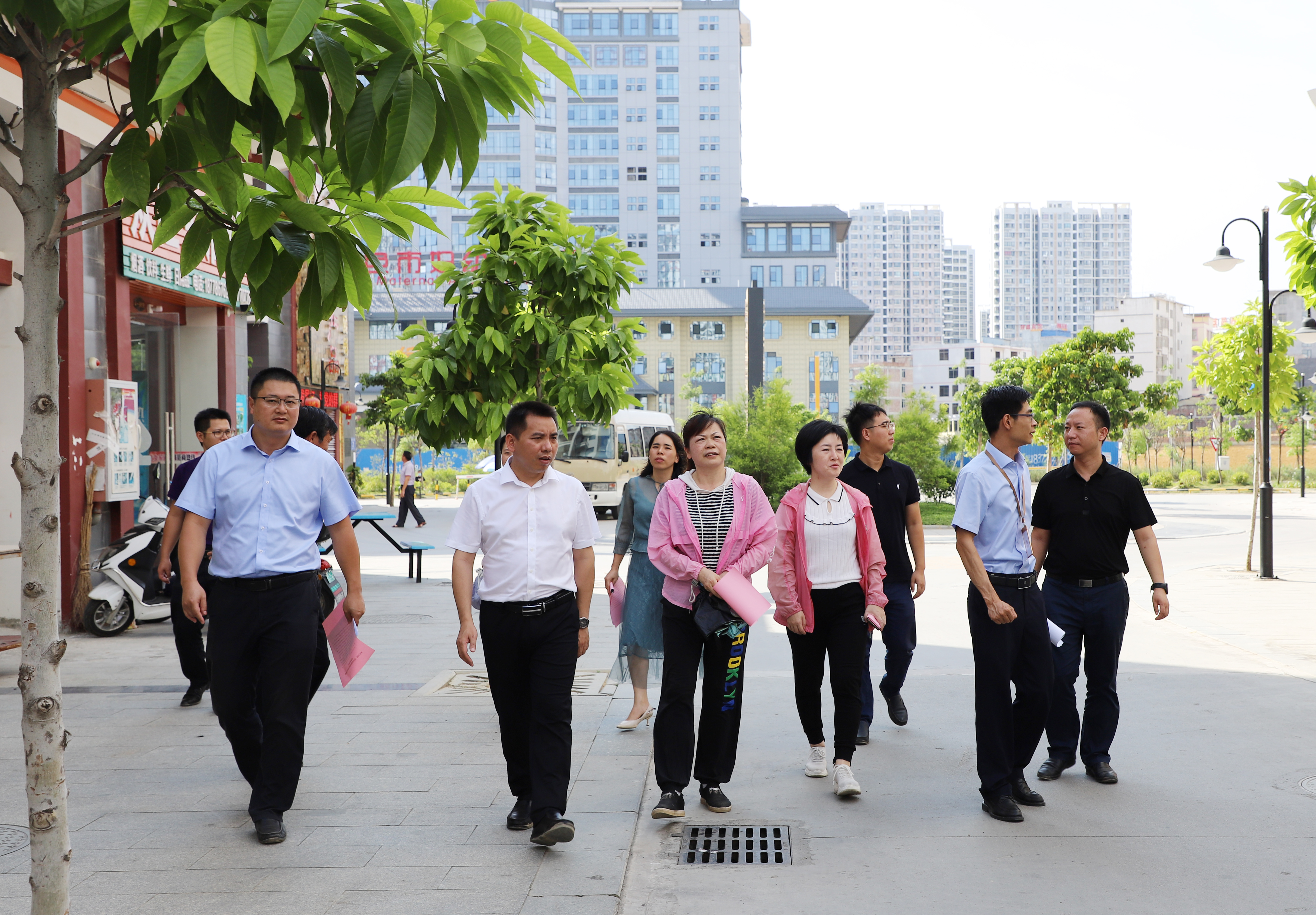(圖為考核組在老鄉(xiāng)家園 - 迎龍易地扶貧搬遷安置小鎮(zhèn)了解村集體經(jīng)濟(jì)項目情況)
