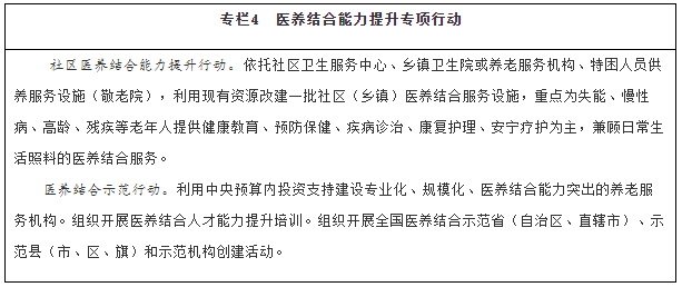 增加醫(yī)養(yǎng)結(jié)合服務(wù)供給。實(shí)施社區(qū)醫(yī)養(yǎng)結(jié)合能力提升行動。積極開展基本公共衛(wèi)生服務(wù)老年健康與醫(yī)養(yǎng)結(jié)合服務(wù)項(xiàng)目。支持優(yōu)撫醫(yī)院、光榮院轉(zhuǎn)型,開展醫(yī)養(yǎng)結(jié)合服務(wù)。推動社區(qū)衛(wèi)生服務(wù)中心與社區(qū)養(yǎng)老服務(wù)機(jī)構(gòu)、鄉(xiāng)鎮(zhèn)衛(wèi)生院與特困人員供養(yǎng)服務(wù)設(shè)施(敬老院)、村衛(wèi)生室與農(nóng)村幸福院毗鄰建設(shè),采取多種有效方式實(shí)現(xiàn)資源整合、服務(wù)銜接。